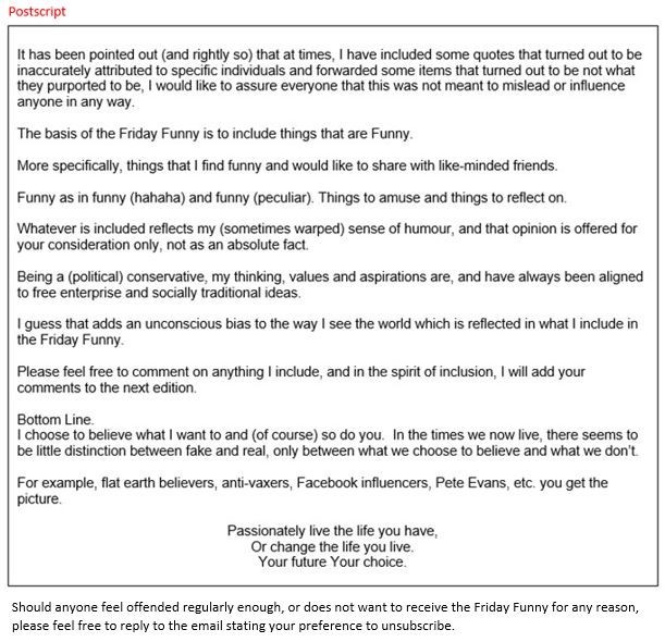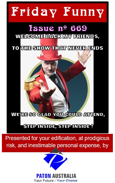 Friday Funny #669 Jan 05 2024 By Barry Paton | January 5, 2024 - 5:00 am |January 3, 2024 Uncategorized ADVERTISEMENTS This sounds like a social media post. Have a great weekend, Cheers Barry Bookmark the permalink.
